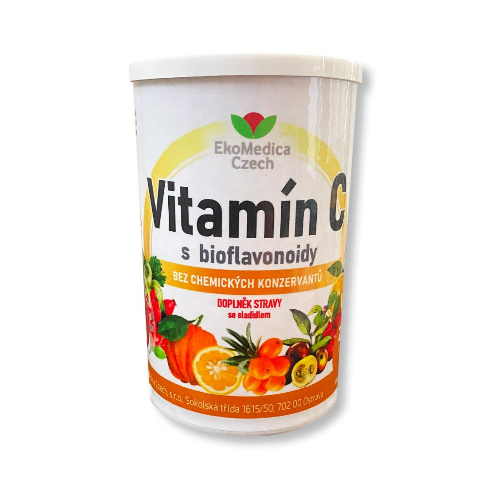 VITAMÍN C s bioflavonoidy je přípravek obsahující vitamín C výlučně z rostlinných zdrojů: ze šťávy z pomeranče a z extraktů standardizovaných na obsah vitamínu C (šípku, embliky, camu camu a aceroly), dále betakaroten z rakytníku a bioflavonoidy z hořkého pomeranče.